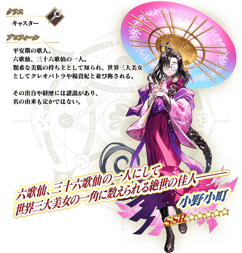 ※「★5(SSR)小野小町」は、霊基再臨してもセイントグラフおよびバトルキャラなどが封印されており第2段階までしか変化しません。