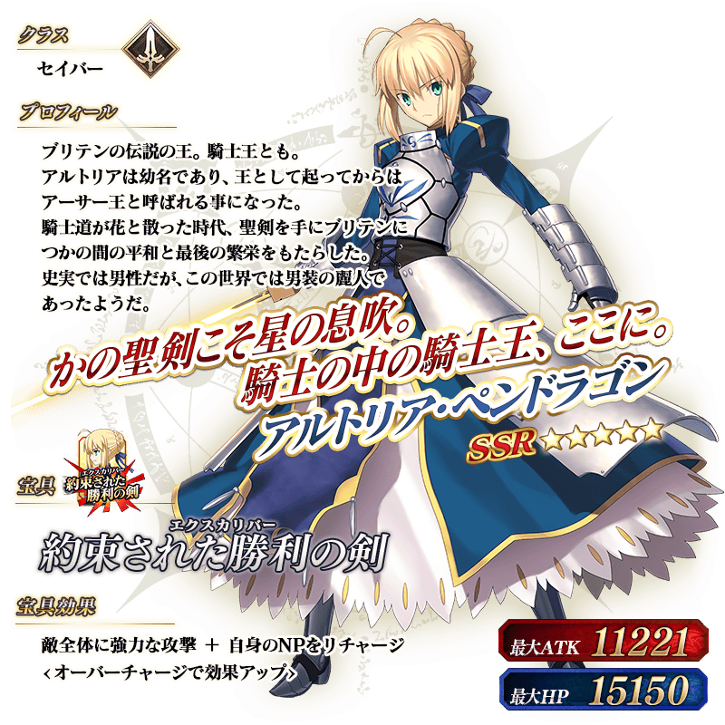 ※上記の「★5(SSR)アルトリア・ペンドラゴン(セイバー)」のイラストは霊基再臨第2段階のものです。