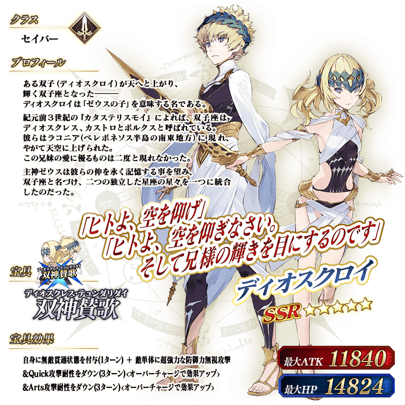 ※上記の「★5(SSR)ディオスクロイ」のイラストは霊基再臨第2段階のものです。