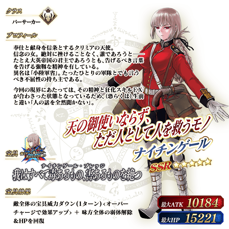 ※上記の「★5(SSR)ナイチンゲール」のイラストは霊基再臨第2段階のものです。