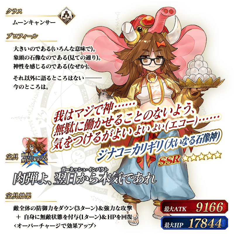 ※上記の「★5(SSR)ジナコ=カリギリ(大いなる石像神)」のイラストは霊基再臨第2段階のものです。 ※「★5(SSR)ジナコ=カリギリ(大いなる石像神)」は、「★5(SSR)大いなる石像神」を霊基再臨第2段階にすることで名称が「★5(SSR)ジナコ=カリギリ」に変化します。