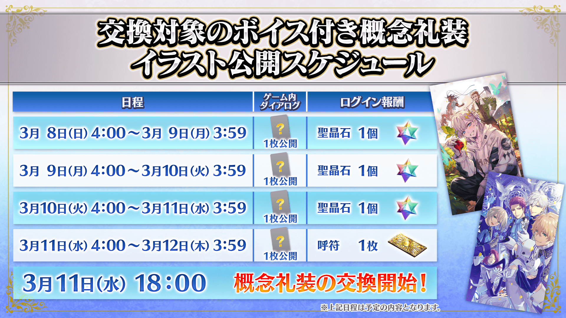 交換対象のボイス付き概念礼装のイラスト公開スケジュールは以下になります。