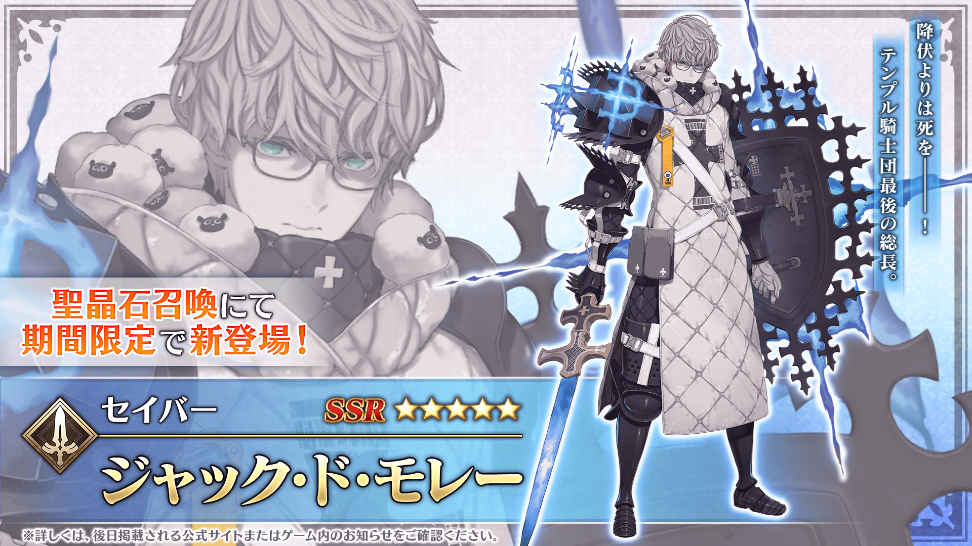 期間限定の聖晶石召喚に新たなサーヴァント「★5(SSR)ジャック・ド・モレー(セイバー)」が登場いたします。