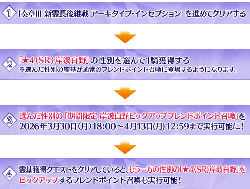 ※「奏章Ⅲ 新霊長後継戦 アーキタイプ・インセプション」のクリア時に獲得した性別の召喚が実行可能です。男女両方の「★4(SR)岸波白野」が通常のフレンドポイント召喚の排出対象になっている場合は両方の召喚を実行できます。