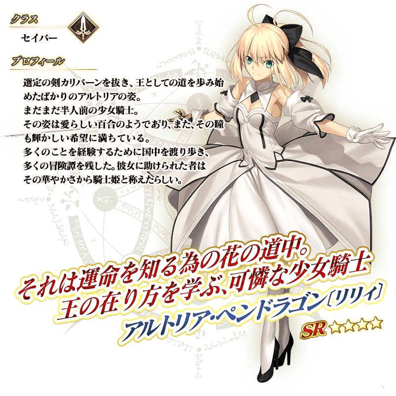※上記の「★4(SR)アルトリア・ペンドラゴン〔リリィ〕」のイラストとセイントグラフは霊基再臨第2段階のものです。