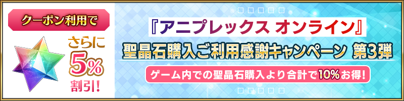 2026年4月25日(土)より期間限定で『アニプレックス オンライン』にて聖晶石を購入する際に、クーポン利用条件を達成し、クーポンコードを入力すると「さらに5%OFF(通常の5%OFFとあわせて合計10%OFF)」にて聖晶石を購入いただけるキャンペーンを実施いたします。