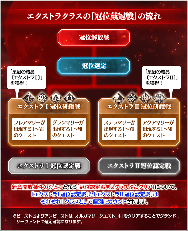 『冠位戴冠戦:Extra』の「冠位研鑽戦」「冠位認定戦」は、エクストラⅠとエクストラⅡに分かれており、それぞれ対応したグループのクラスのサーヴァントのみ挑戦することができます。