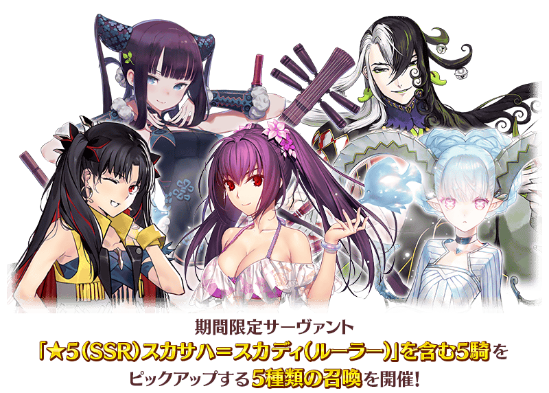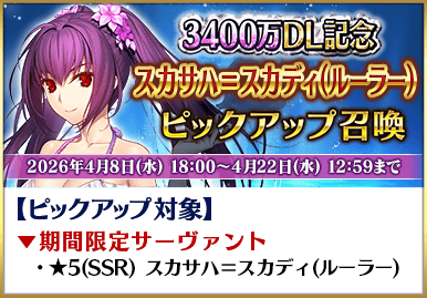3400万DL突破を記念して、期間限定サーヴァント「★5(SSR)スカサハ=スカディ(ルーラー)」を含む5騎をピックアップする5種類の召喚を開催いたします!