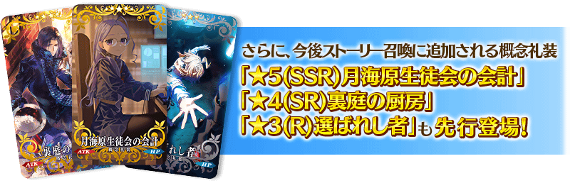 さらに、今後ストーリー召喚に追加される概念礼装3種が先行登場するほか、★4(SR)および★3(R)概念礼装のラインナップを一部リニューアルいたします!