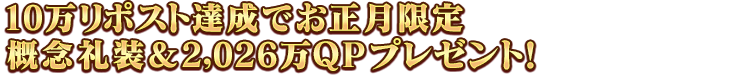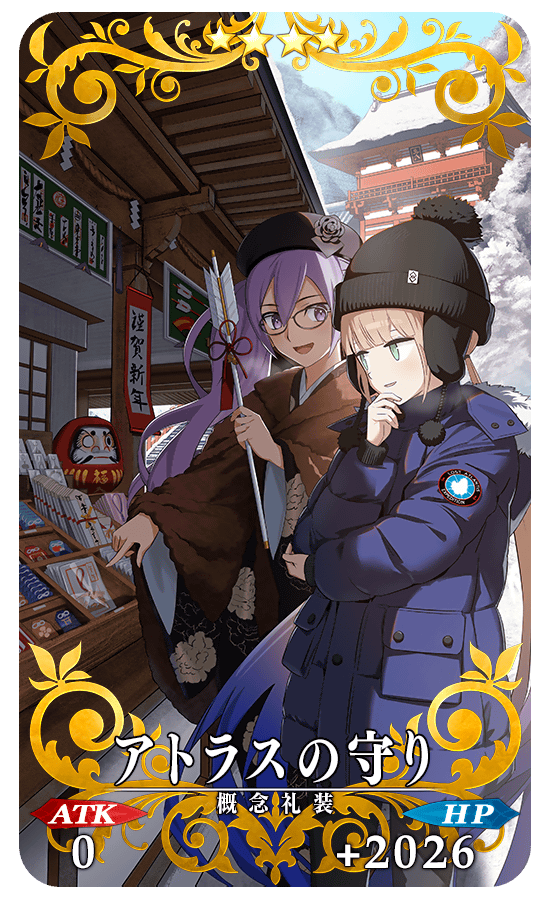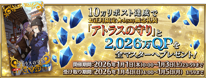 公式X(Twitter)にて、2026年1月1日(木)・2日(金)・3日(土)の各日0時に投稿される「2026年お正月キャンペーン開催!」ポストのリポスト数が、下記の期間内で合計10万リポストを達成すると、ゲームをプレイしているすべてのマスターに概念礼装「★4(SR)アトラスの守り」と2,026万QPをプレゼント!