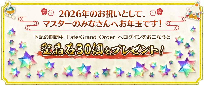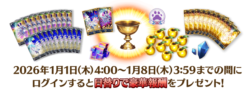 【お正月ならではのキャンペーン】 [期間限定]お年玉ログインボーナス! [期間限定]期間限定サーヴァント「★5(SSR)ロード・ログレス」が新登場! [期間限定]ロード・ログレスの体験クエストを開催! [期間限定]最大2回!有償聖晶石15個で召喚可能な「福袋召喚」を開催! [期間限定]10万リポスト達成でお正月限定概念礼装&2,026万QPプレゼント! [期間限定]7日間にわたって日替りで豪華報酬をプレゼント! [期間限定]連続ログインボーナスに「おみくじボーナス」が登場! [期間限定]お正月特別パネルミッションを開催! [期間限定]魔術礼装「ウィンターカジュアル」獲得クエストが再登場! [期間限定]デイリーミッションお正月限定版を開催! [期間限定]【お正月2026交換券】が手に入る限定ミッションを追加! [期間限定]スタートダッシュログインボーナスの一部報酬が2倍! [期間限定]カムバックログインボーナス! [期間限定]マイルームを特別なお正月仕様に変更!