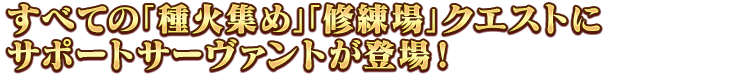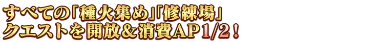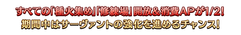 【サーヴァントを強化するチャンス】 [期間限定]サーヴァント強化と概念礼装強化の大成功&極大成功率が2倍! [期間限定]すべての「種火集め」「修練場」クエストを開放!&消費AP1/2! [期間限定]すべての「種火集め」「修練場」クエストにサポートサーヴァントが登場! [期間限定]フレンドポイント獲得量が2倍!