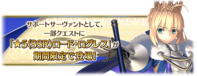 下記の期間中、期間限定で「種火集め」、「修練場」の一部クエストにサポートサーヴァントとして「★5(SSR)ロード・ログレス」が登場します!