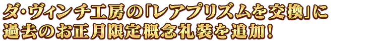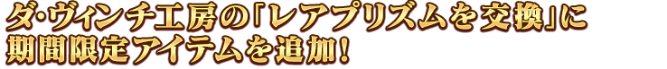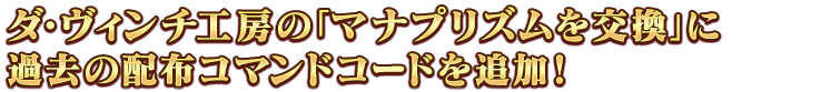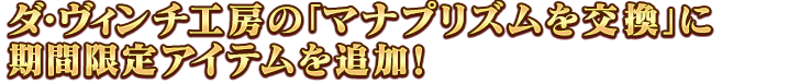 【ダ・ヴィンチ工房が充実】 [期間限定]ダ・ヴィンチ工房の「マナプリズムを交換」に期間限定アイテムを追加! [期間限定]ダ・ヴィンチ工房の「レアプリズムを交換」に期間限定アイテムを追加! [恒常]ダ・ヴィンチ工房の「マナプリズムを交換」に過去の配布コマンドコードを追加! [恒常]ダ・ヴィンチ工房の「レアプリズムを交換」に過去のお正月限定概念礼装を追加!