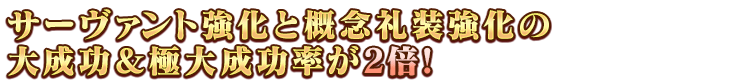 下記の期間中、サーヴァントおよび概念礼装の強化をおこなった際に、大成功(経験値2倍ボーナス)・極大成功(経験値3倍ボーナス)の発生率が期間限定で2倍になります!